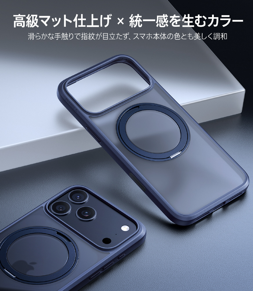 回転式スタンドが背面に搭載されたOstand Proは、縦置き・横置き自由自在。MagSafe対応で充電もスムーズ。使いやすさと美しさを両立した高機能ケースです。
