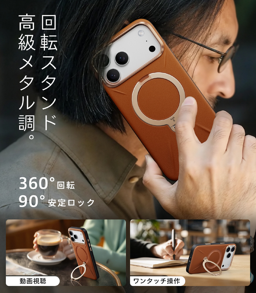 レザー調の上品な質感と360°回転スタンドを融合したQ3レザートーン。ビジネスでもプライベートでも映える、大人のための高機能ケースです。