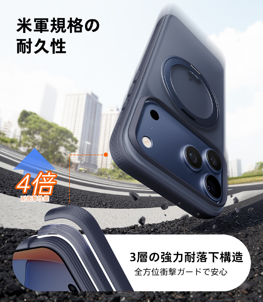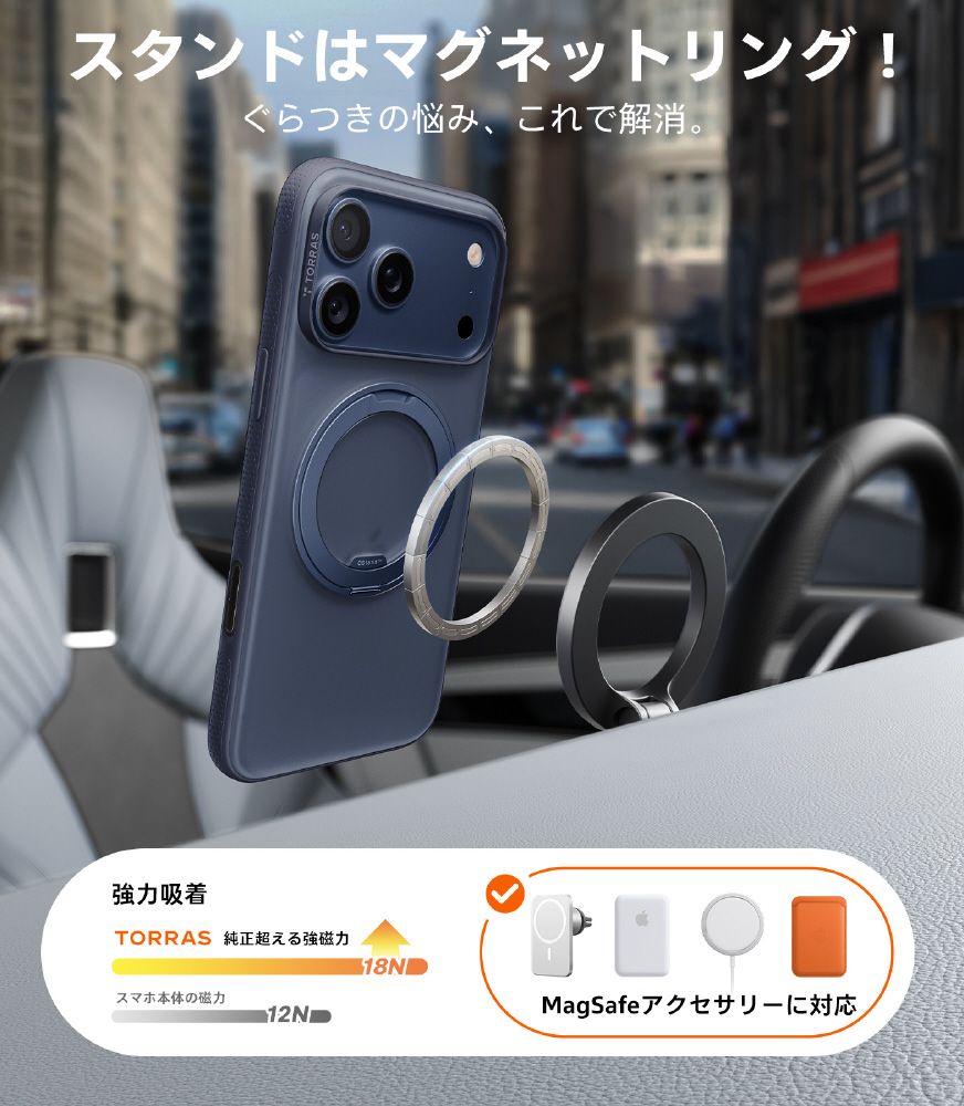 ・TORRAS独自の「Halbach」マグネット技術により、N52マグネットブラケット38個が内蔵され、MagSafeアクセサリーにしっかり吸着します。(Apple純正MagSafeケースの磁力(10N)の約1.7倍。)