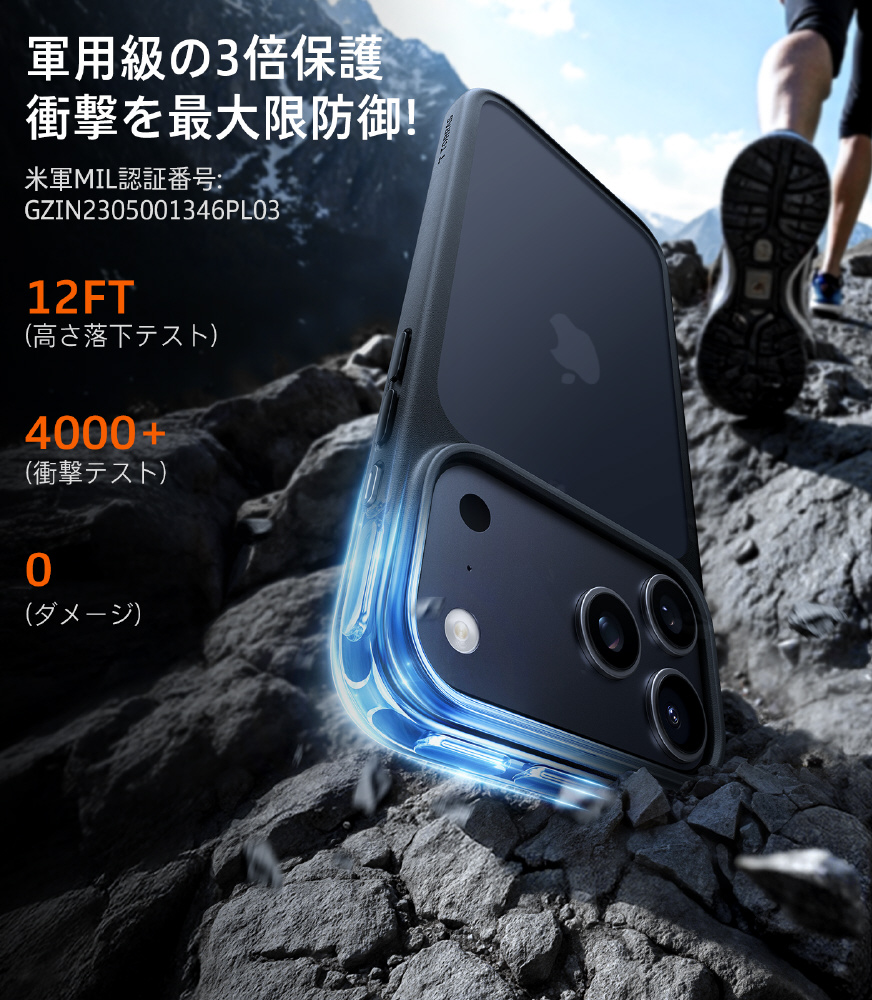 ・米軍規格MIL-STD-810Gに準拠。3.66mからの落下にも耐えるタフな設計。エコ素材を採用し、安心安全に配慮しました。