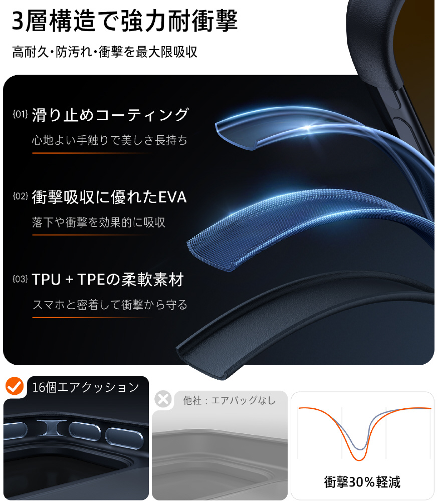 ・360°衝撃を吸収できるエアクッションのデザインのため、衝撃を受けやすい4隅から全方向にスマホとカメラをしっかり保護できます。