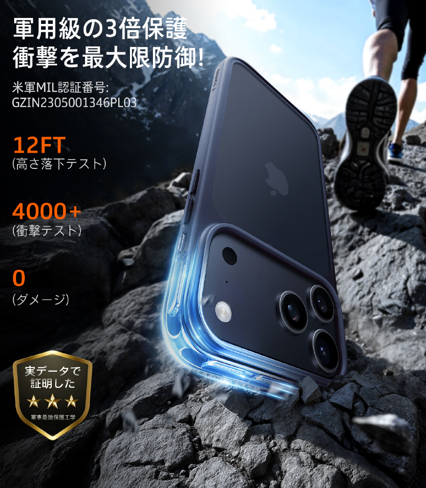 ・米軍規格MIL-STD-810Gに準拠。3.66mからの落下にも耐えるタフな設計。エコ素材を採用し、安心安全に配慮しました。