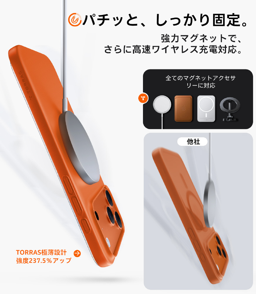 ・TORRAS独自のHalbachマグネットテクノロジー、内蔵の38N52マグネットにより、MagSafeアクセサリと互換性があります。