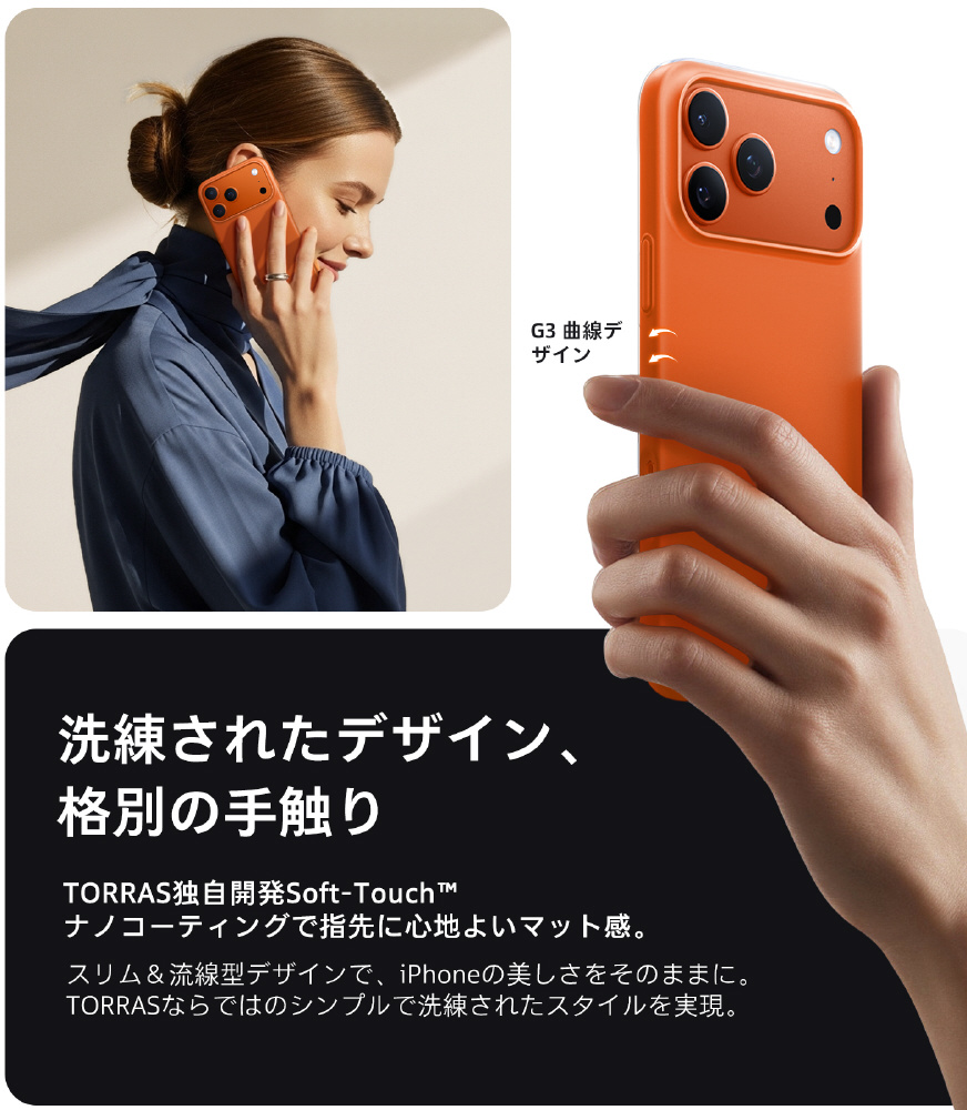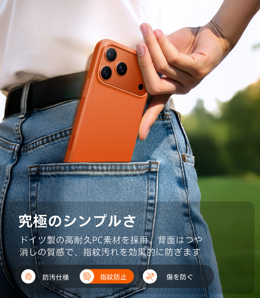 ・厳選されたPC素材を使用、背面はつや消しの質感で、非常に滑らかな感触です。指紋痕を効果的に防ぎます。
