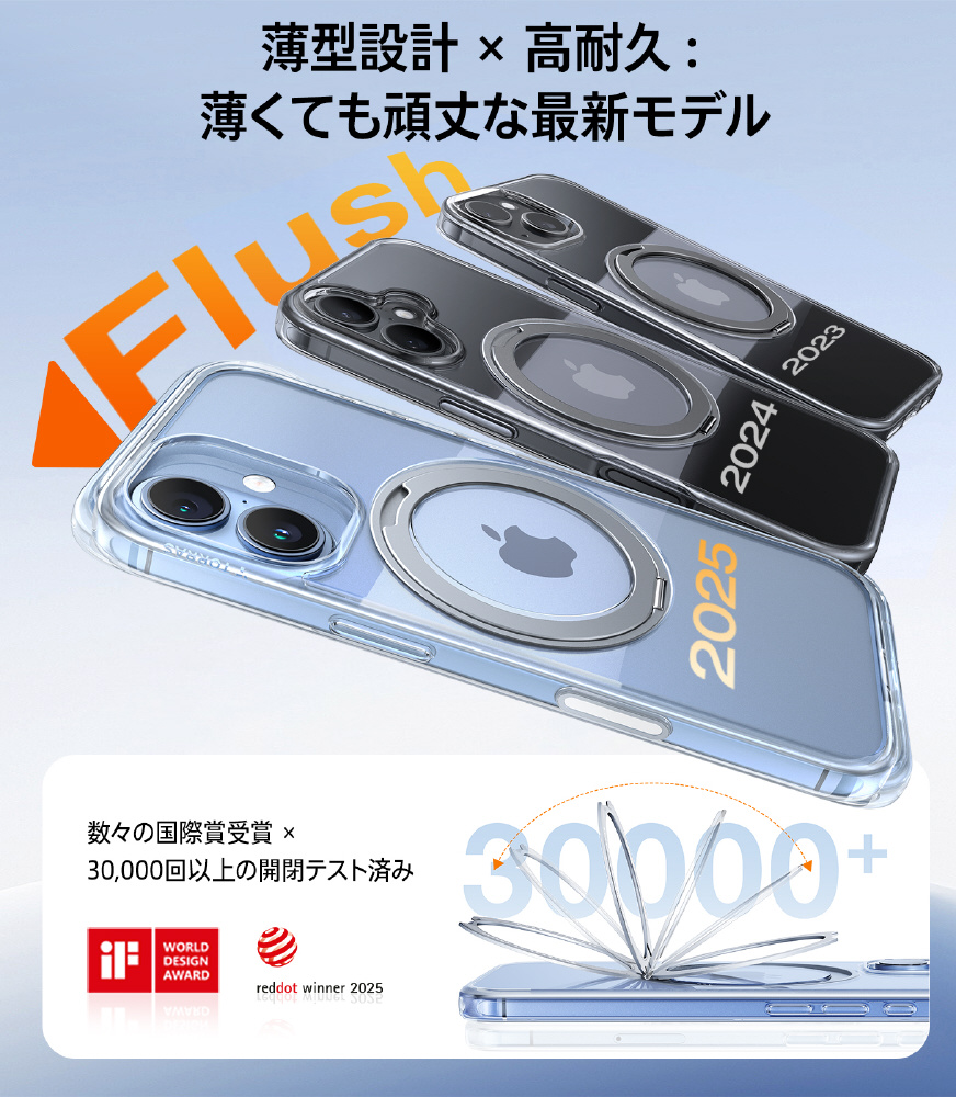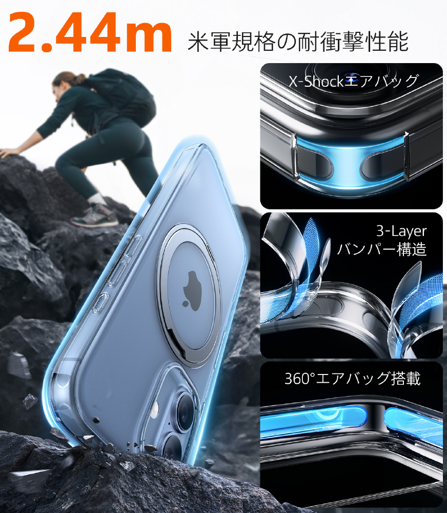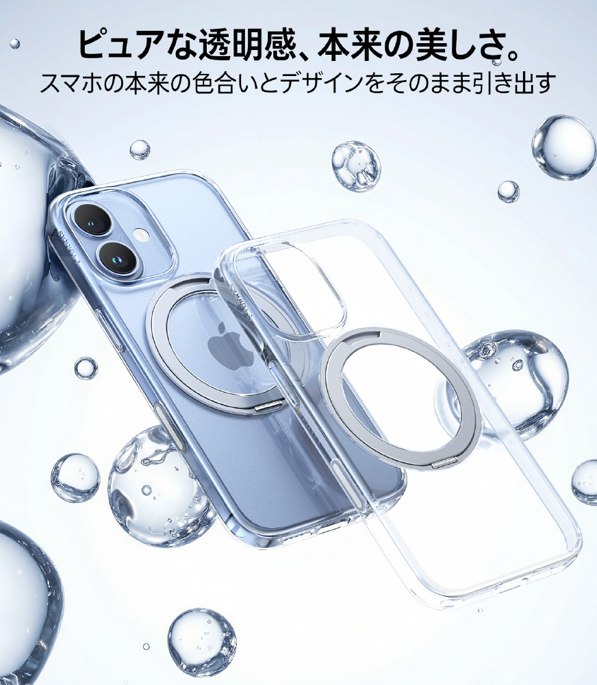 回転式スタンドが背面に搭載されたOstand Proは、縦置き・横置き自由自在。MagSafe対応で充電もスムーズ。使いやすさと美しさを両立した高機能ケースです。