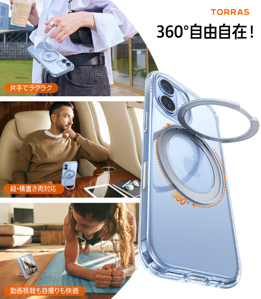 ・360°回転可能なリングスタンドによって、あらゆる角度に調節でき、映画鑑賞、テレビ電話、勉強、撮影など様々な利用シーンに対応。