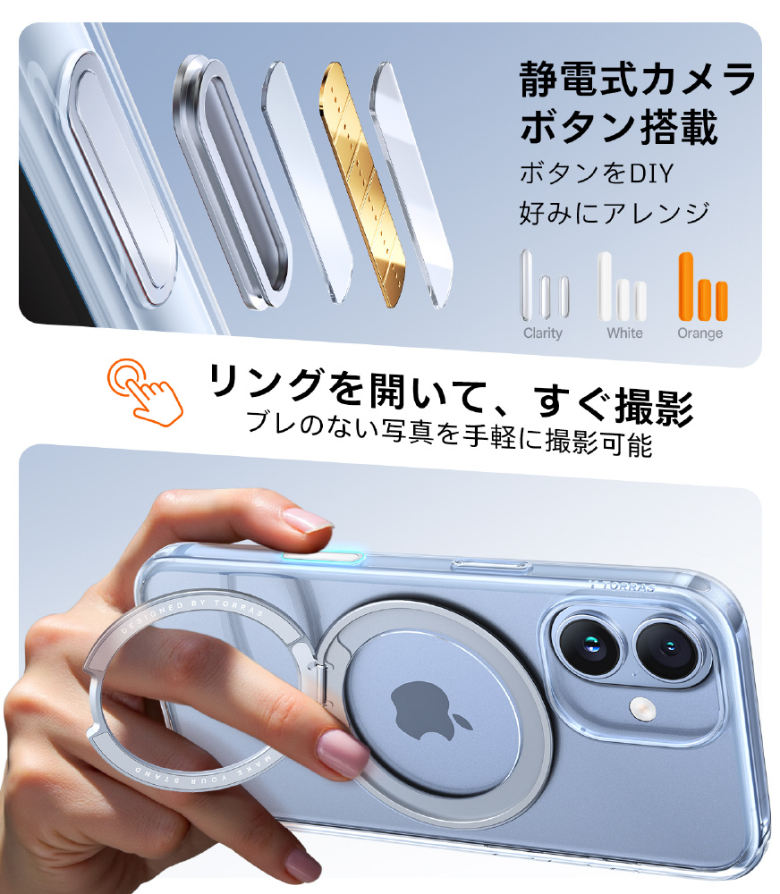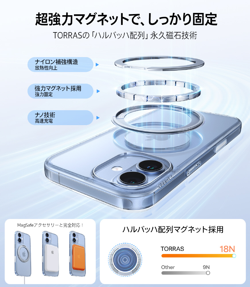 ・TORRAS独自の「Halbach」マグネット技術で、N52マグネットブラケット38個が内蔵され、磁力は18N、MagSafeアクセサリーに対応。