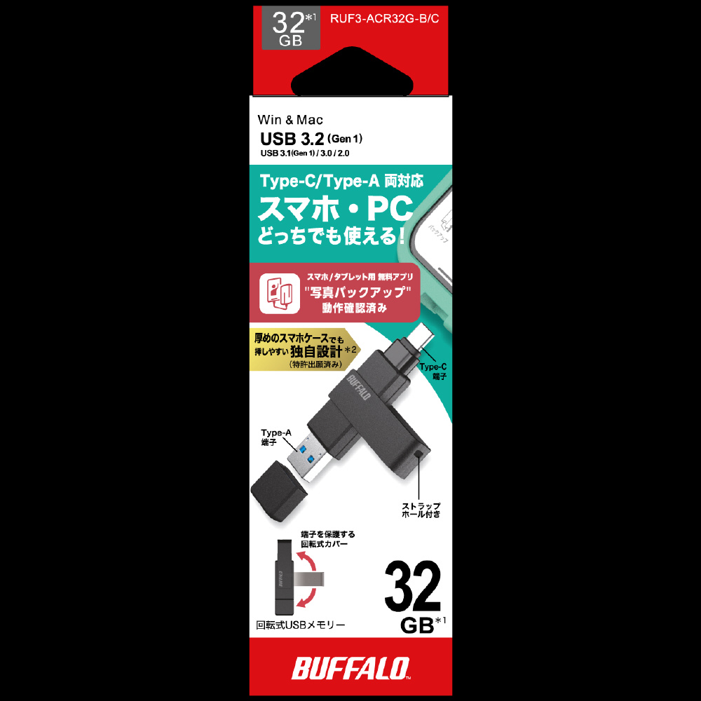USBメモリ (Chrome/Android/iPadOS/iOS/Mac/Windows11対応) ブラック RUF3-ACR32G-B/C [32GB /USB TypeA+USB TypeC /USB3.2 /回転式]