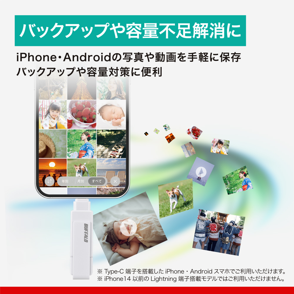 本商品は、バッファローアプリ「写真バックアップ」(無料)に対応。大切な思い出をもっと簡単に保存できます。