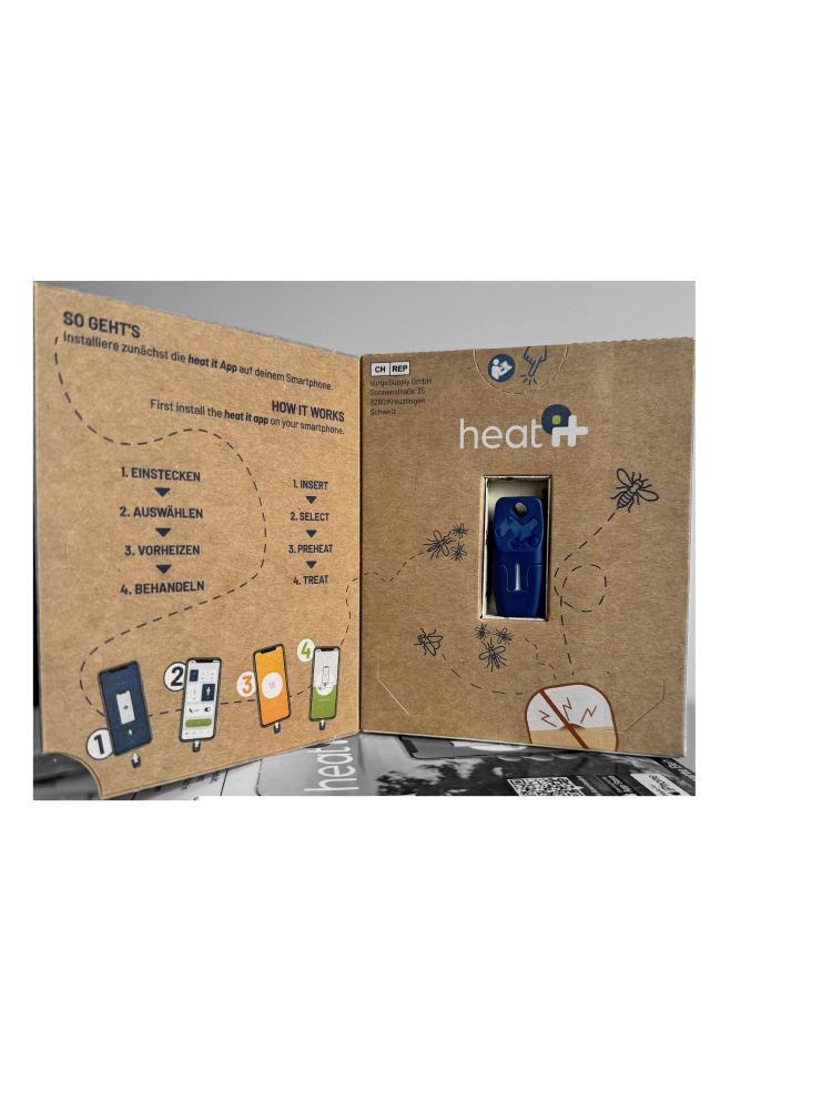 ヒートイットはスマートフォンの充電ポートに挿し込んで使用する虫さされ対策機器です。患部を約51℃で短時間温めます。