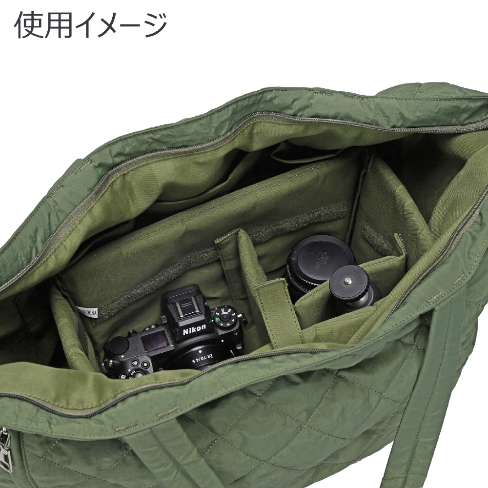 ナチュラルな雰囲気の大きめキルティングトートバッグに、同色のカメラインナーボックスをセット。軽量な生地を使用した、ソフトな手触りのトートバッグです。カメラインナーは衝撃に強い10mm厚の蓋付きボックスタイプ。