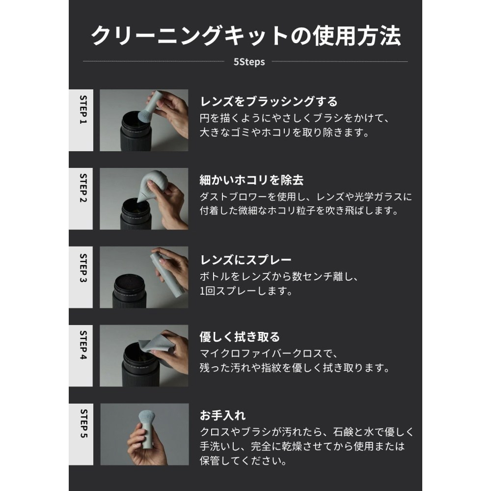 プロフェッショナル品質のケアで、カメラ、レンズ、フィルター、 テックギアをお手入れ。 シリコンエアブロワー、超極細ダストブラシ、マイクロファイ バークロス、植物由来のクリーニングスプレーがセット。 ナノコーティングされたレンズや光学ガラスにも安全で、優しく徹底的にクリーニング。植物由来の成分とリサイクル素材を使用してます。