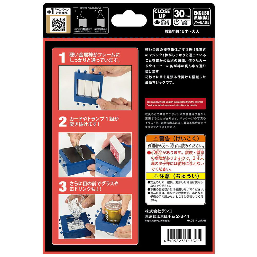 棒がしっかりと通っていることを確かめた次の瞬間、借りたカードやコーヒーの缶が棒の真ん中を通り抜けます!