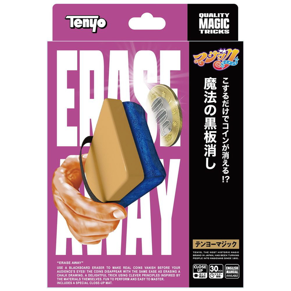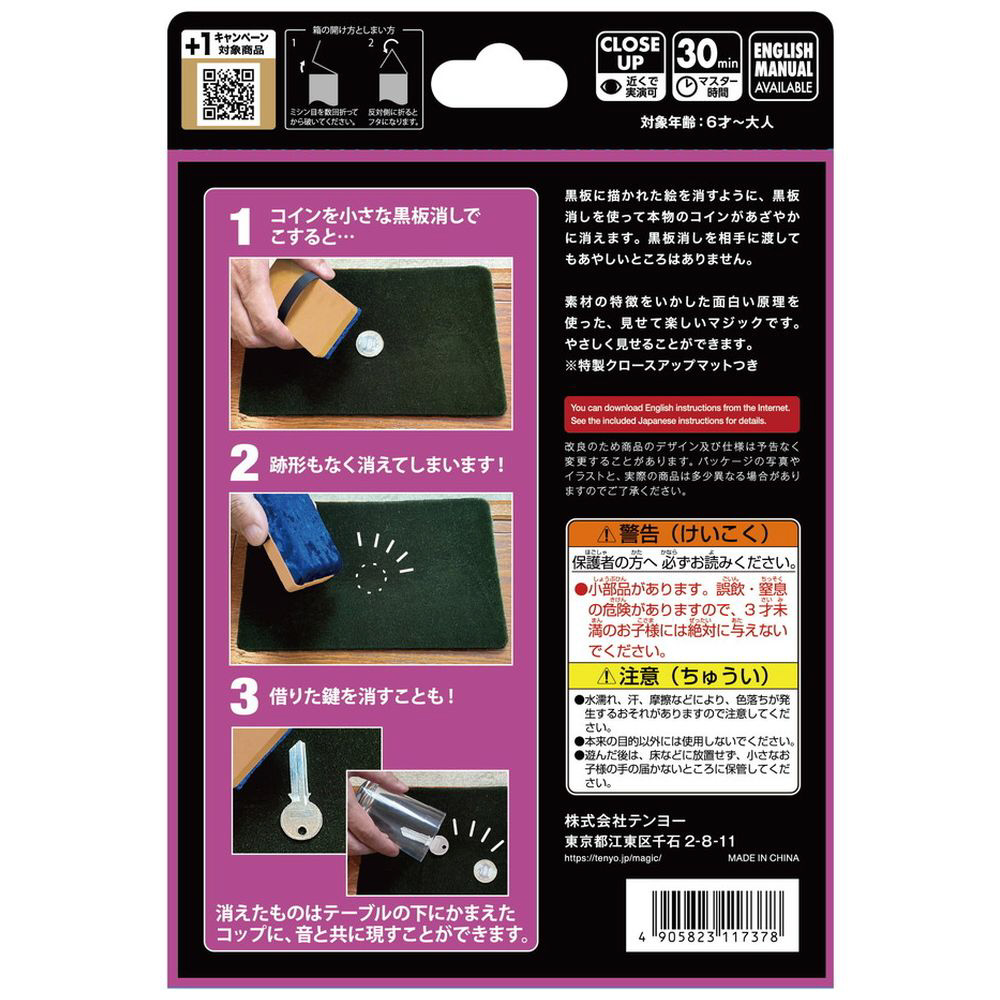 黒板に描かれた絵を消すように、黒板消しを使って本物のコインがあざやかに消えます。