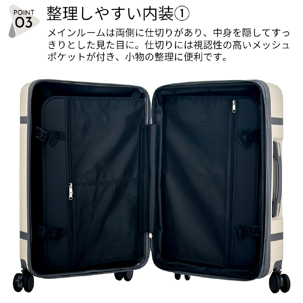 メインルームは両側に仕切り付きで中身を隠せ、見た目もすっきり。仕切りには視認性の高いメッシュポケットが付いており、小物の整理に便利です。さらに、荷物をしっかり押さえるクロスベルトも両側に装備し、移動中の荷崩れを防ぎます。