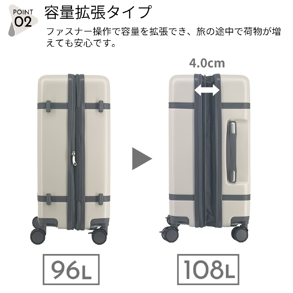 Lサイズ(約96L/拡張時108L)は、7泊以上の長期旅行や荷物の多い出張に最適です。