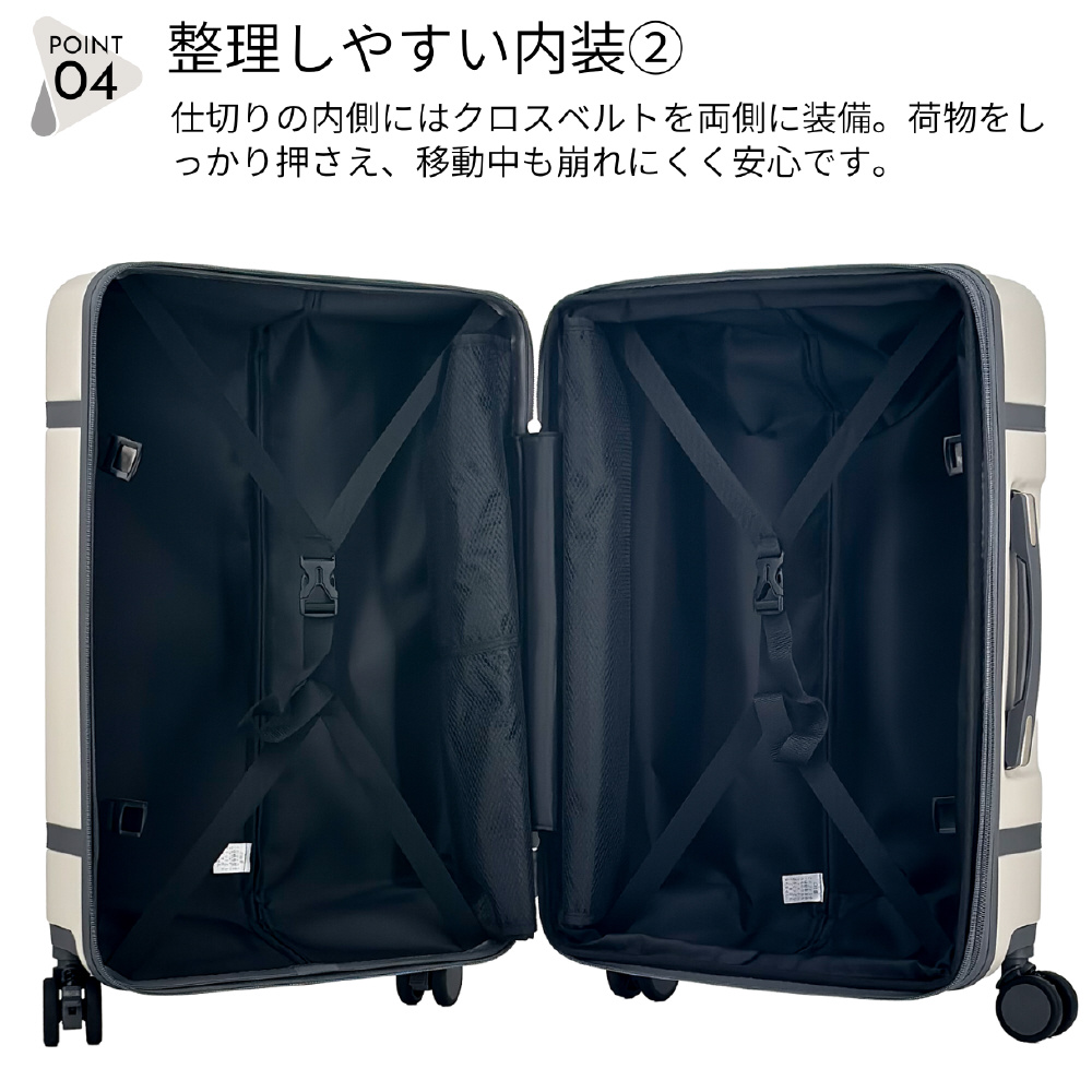 メインルームは両側に仕切り付きで中身を隠せ、見た目もすっきり。仕切りには視認性の高いメッシュポケットが付いており、小物の整理に便利です。さらに、荷物をしっかり押さえるクロスベルトも両側に装備し、移動中の荷崩れを防ぎます。