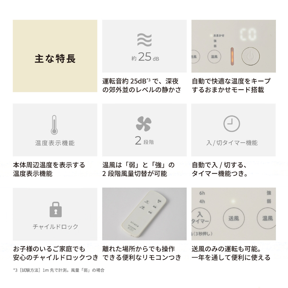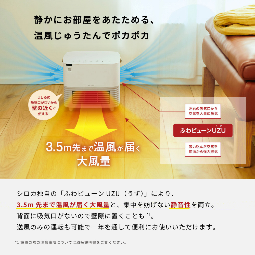 本体左右の吸気口から空気を取り込み、本体前面から送風する「ふわビューンUZU(うず)」により、約3.5m先まで温風が届き、お部屋をあたためます。また、静音性の高さも特長で、温風・弱で運転した場合の運転音は約25dBと、深夜の郊外と同じレベルの静かさ。睡眠時にも稼働音を気にせずお使いいただけます。