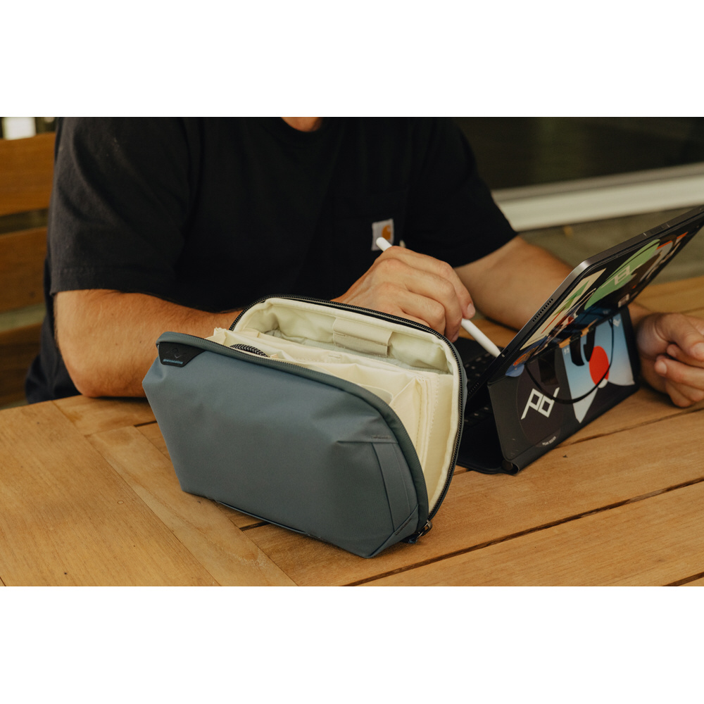 ケーブルやバッテリーなどアクセサリー類の整理、スマートフォンや手帳など小物の収納にも適したポーチ。上部に、持ち運びに便利なハンドル付き。開口部が大きく開き自立し、視認性とアクセス性にも優れています。
