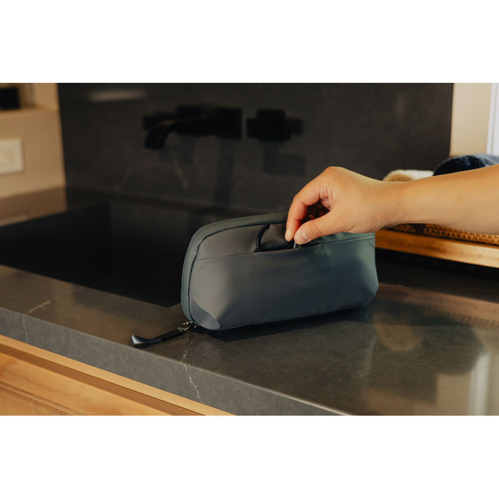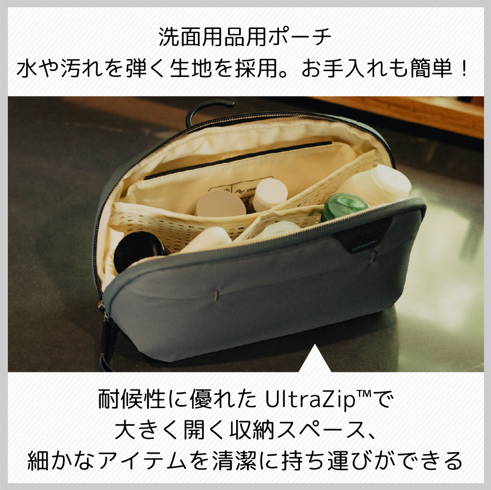 内側にジッパーポケットとマグネットで閉じる歯ブラシポケットを備え、細かなアイテムを整理して清 潔に保つことができます。