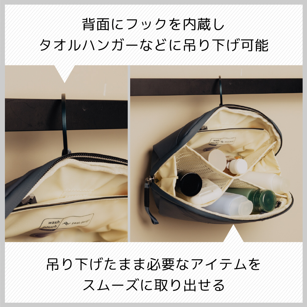 ポーチ背面には、タオルハンガーなどに吊り下げるための丈夫なアルミニウム製フックを内蔵しています。