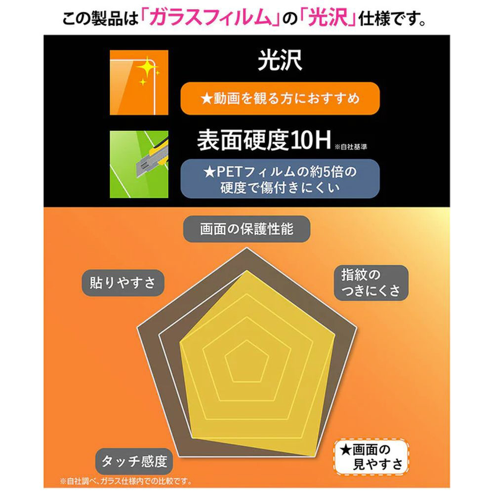PETフィルムの約5倍の硬度で傷付きにくい。美しい光沢仕様で、高画質な写真や動画が綺麗に見える。