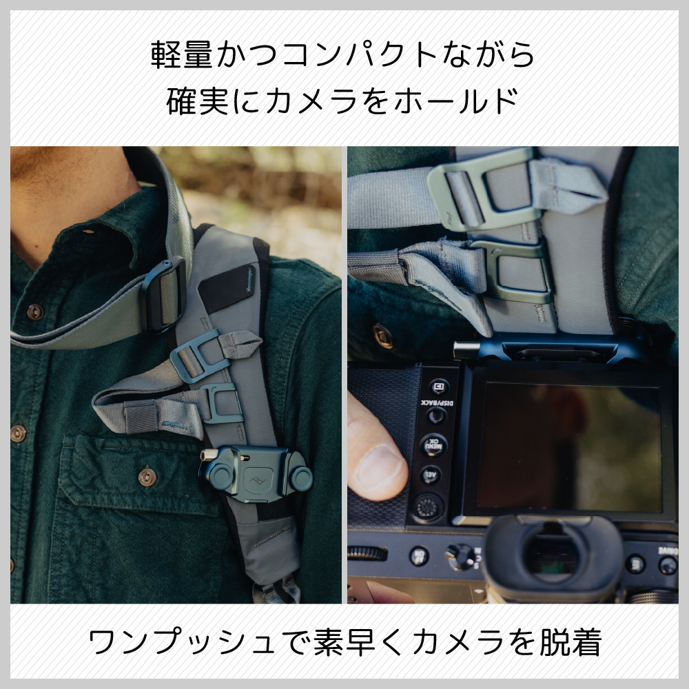 キャプチャーとスタンダードプレートのセット。軽量かつコンパクトながらも確実にカメラをホールドします。シャッ ターチャンスに素早くワンプッシュでカメラを脱着できるクイックリリースプレート機構を持ちます。