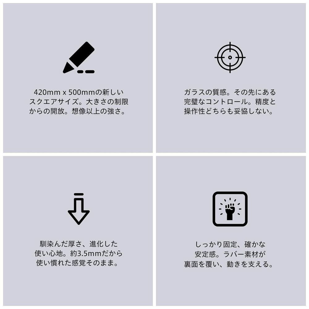 500mm×420mm。この大胆なサイズ設計が、操作を制限するストレスから解放し、マウスの動きを余すことなく正確に反映。叢雲とともに、新しい可能性を見つけよう。