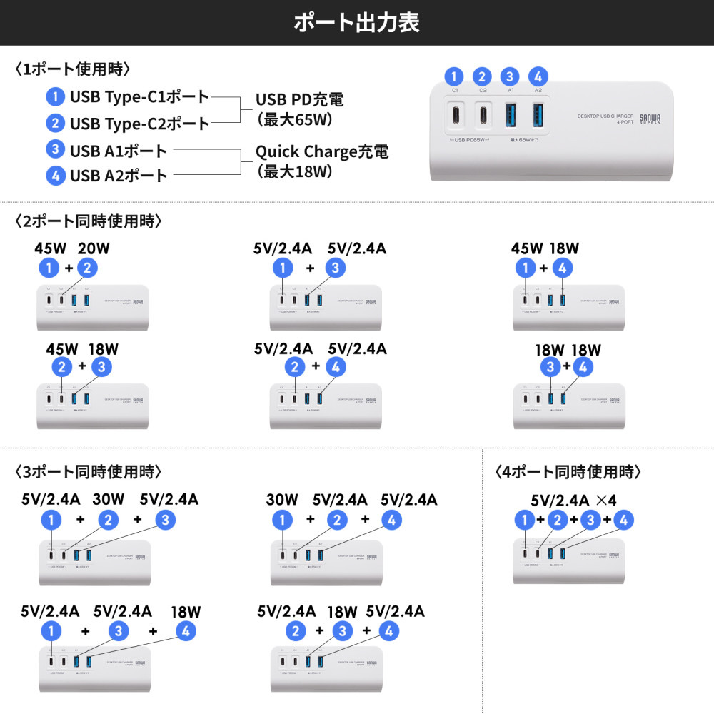■USB Type-Cポート×2、USB Aポート×2の合計4ポートを備え、最大4台までの同時充電が可能です。
