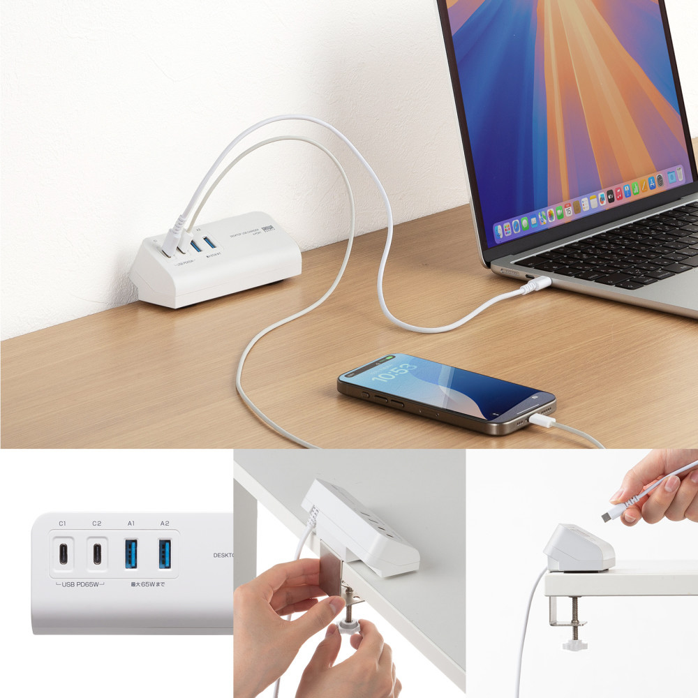 AC-USB充電器 ノートパソコン・タブレットPC対応 PD65W [2m /4ポート:USB-Cx2+USB-Ax2 /USB Power Delivery対応] クランプ式 ホワイト ACA-PD106W