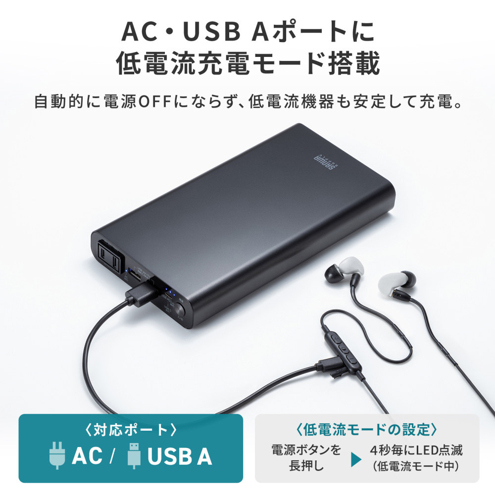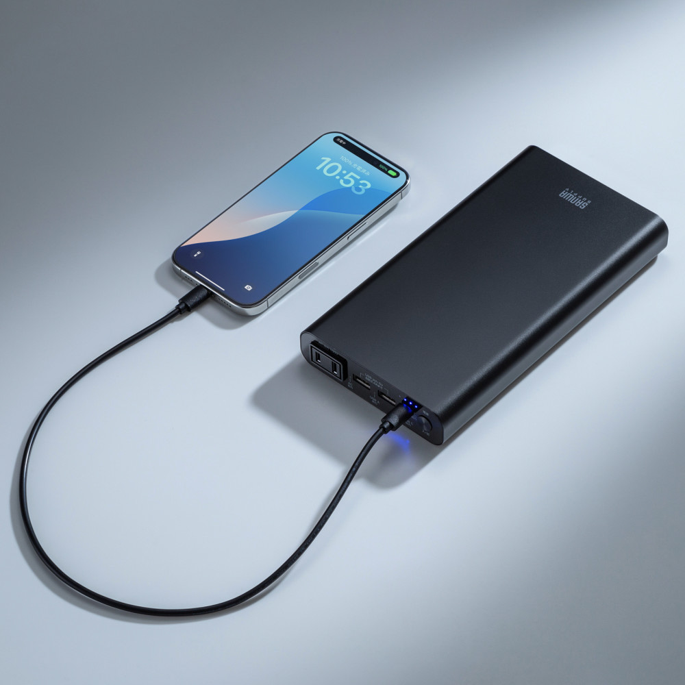 ノートパソコンへの給電に最適な、ACコンセントプラグを直接挿せるAC出力付きモバイルバッテリー。USB PD給電にも対応。