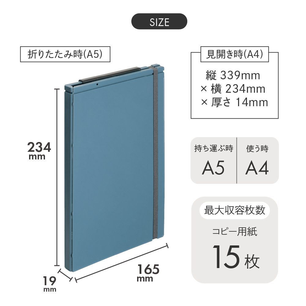 ●本体寸法:幅×奥行×高さ 234×14×339mm●本体重量:200g●規格:A5(A4・2ツ折)●材質:本体/ポリプロピレン、とじ具・スライダー/ABS樹脂、ゴムバンド/ポリエステル・ポリウレタン●色:スレートブルー