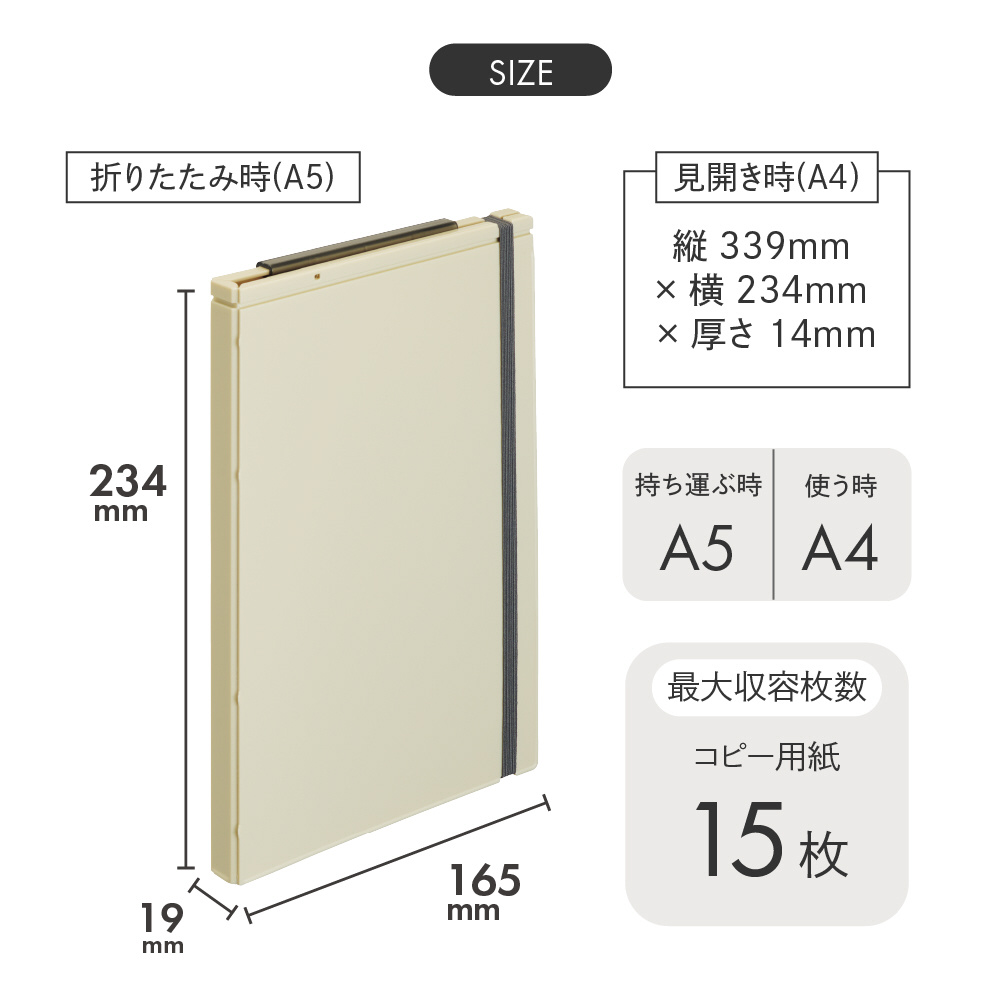 ●本体寸法:幅×奥行×高さ 234×14×339mm●本体重量:200g●規格:A5(A4・2ツ折)●材質:本体/ポリプロピレン、とじ具・スライダー/ABS樹脂、ゴムバンド/ポリエステル・ポリウレタン●色:アイボリー