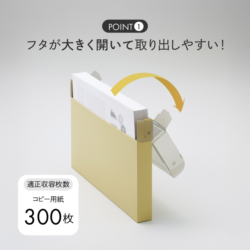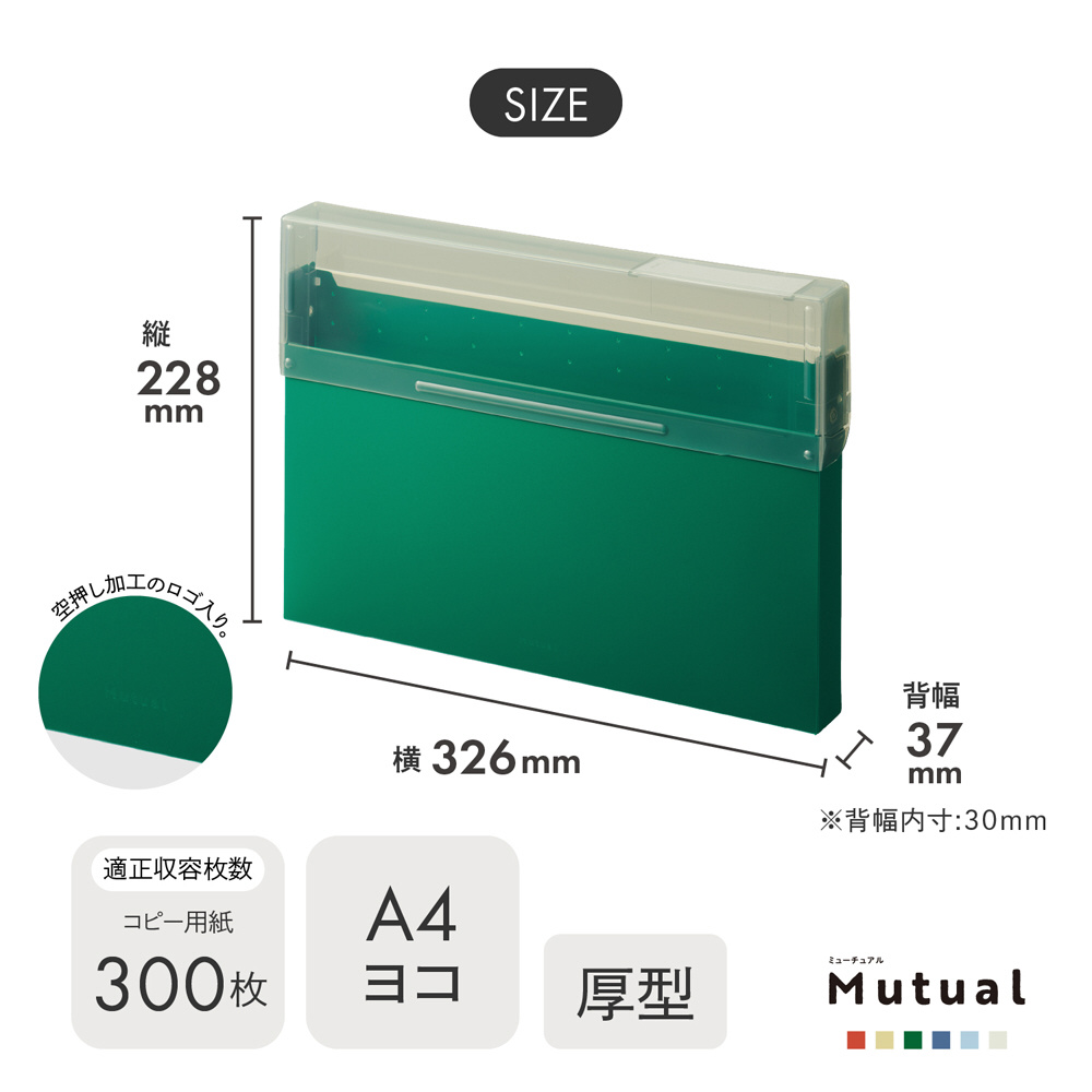 ●本体寸法:幅×奥行×高さ 326×37×228mm●本体重量:186g●規格:A4・ヨコ●収容量:コピー用紙300枚●材質:本体(不透明)・フタ(色透明)/ポリプロピレン(本体生地厚:0.75mm)、見出し紙/上質紙、見出しカバー/PET●色:ディープグリーン