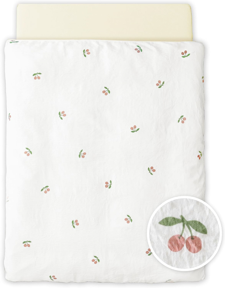 かけ布団・かけ布団カバー・敷き布団・敷き布団カバーの4点セット。先輩ママたちの声から、あえて枕は入れていません。赤ちゃんの背骨はやわらかくCカーブになっている為枕がなくても首に負担がなく、眠ることができます♪「結局枕は使わなかった」という声も多いため枕を入れず、本当に必要なものだけをこだわってつくりました。
