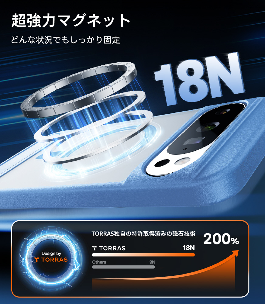 ・TORRAS独自の特許取得済みHalbach磁石技術:内蔵された38個のN52磁石により18Nの吸着力を実現し、すべてのMagSafe対応アクセサリーに対応可能