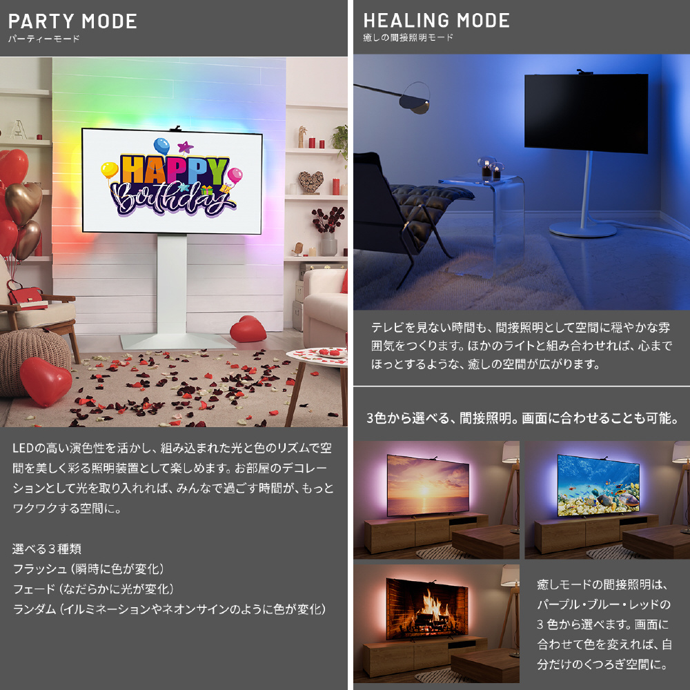 映画・ライブ・ゲーム・スポーツの映像にシンクロし同調した光がお部屋に広がる拡張型LEDライト。使用することでより映像に没入できる空間に変わります。テレビ背面に掛けるだけで簡単に設置可能。65〜70インチテレビ対応。