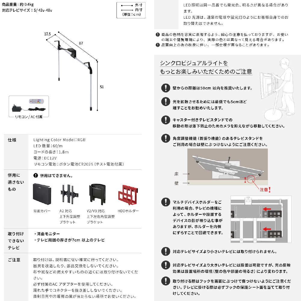 テレビへの取り付けはフックで掛けるだけでネジや両面テープは不要です。LEDライトはパーツをつなぎ合わせるだけで工具は不要です。壁に光が反射して光の色彩や光の広がりをお楽しみ頂けます。そのため、テレビは壁から5〜50cmの位置に設置を推奨致します。