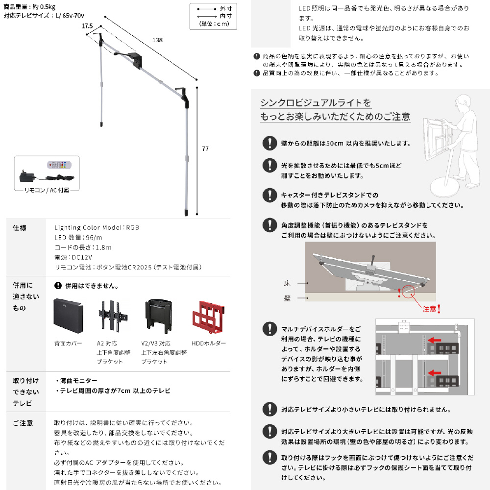 テレビへの取り付けはフックで掛けるだけでネジや両面テープは不要です。LEDライトはパーツをつなぎ合わせるだけで工具は不要です。壁に光が反射して光の色彩や光の広がりをお楽しみ頂けます。そのため、テレビは壁から5〜50cmの位置に設置を推奨致します。