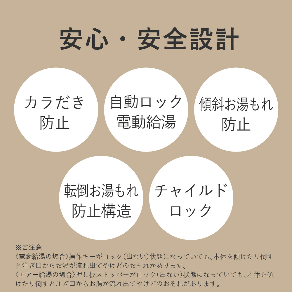通電時は指一本で注げる電動給湯、電源のない場所では、プラグを外していても注げるエアー給湯でお湯が注げます。