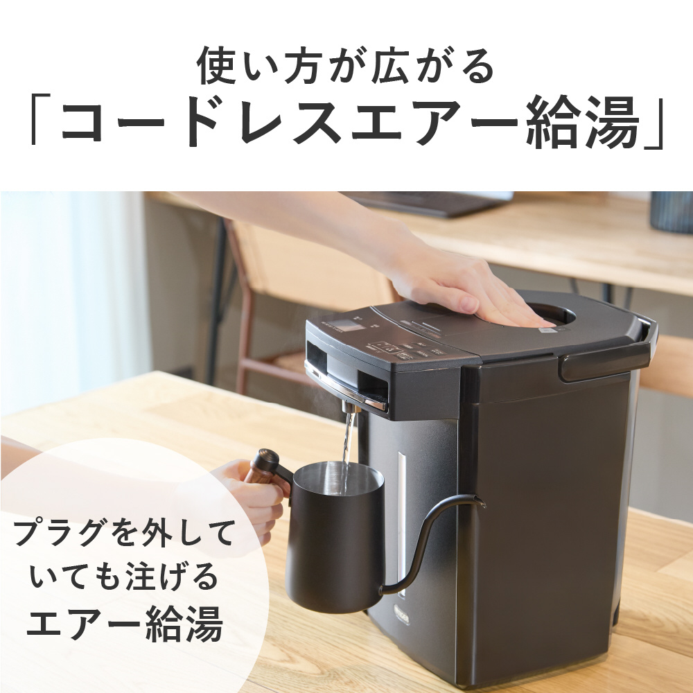 通電時は指一本で注げる電動給湯、電源のない場所では、プラグを外していても注げるエアー給湯でお湯が注げます。
