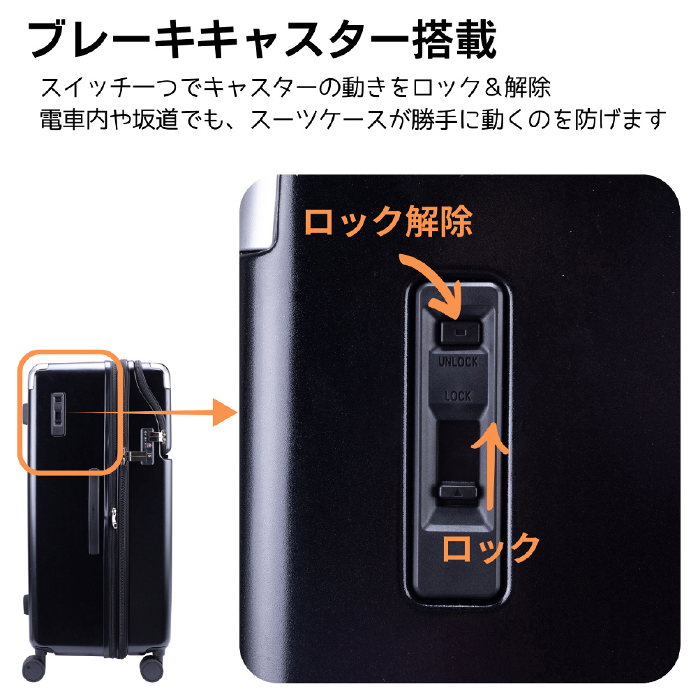 ワンタッチで後輪を固定できるキャスターストッパーを搭載。電車やバス、空港や坂道で不意な走行を防止します。