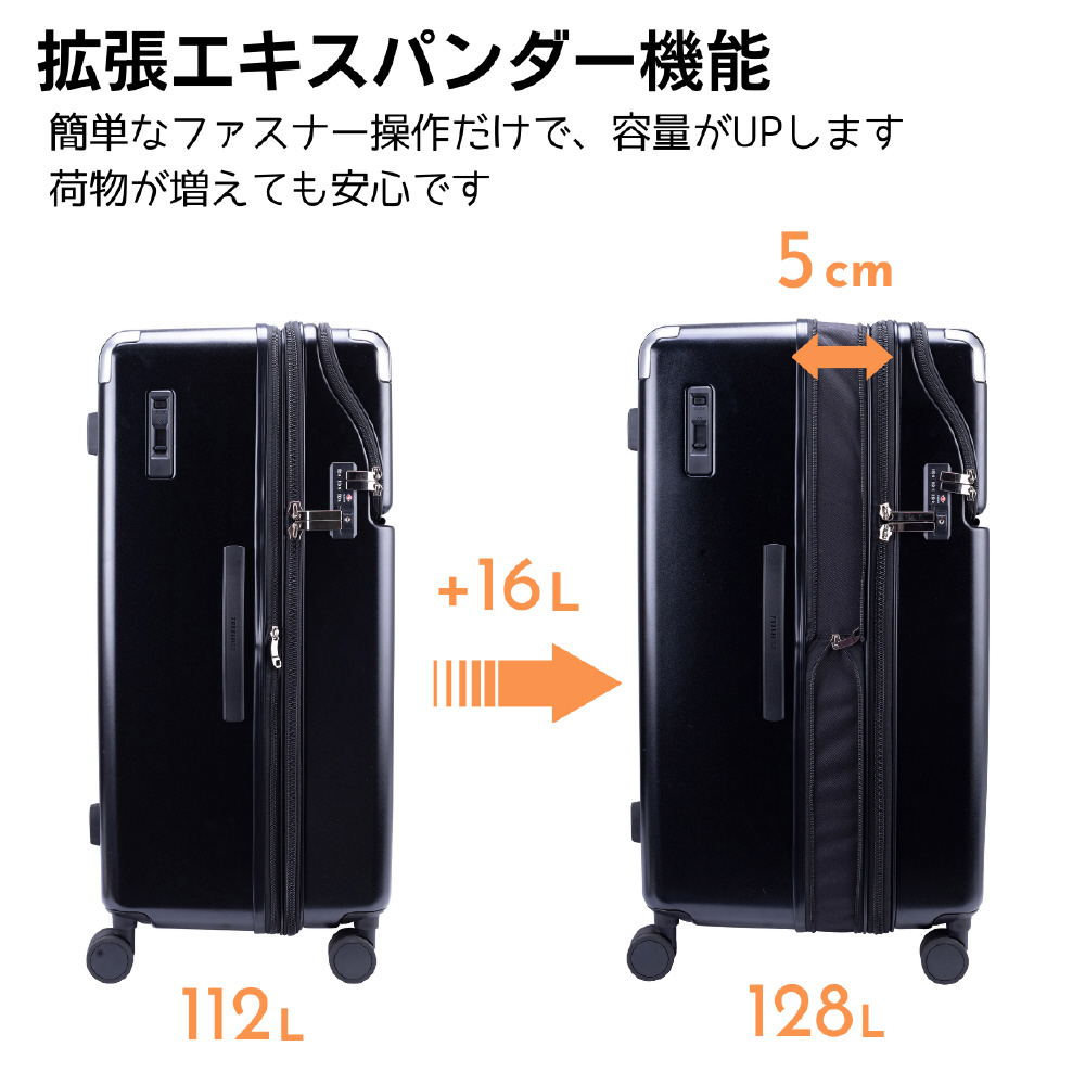 拡張ファスナーを開けば、容量は112Lから最大128Lに。長期滞在や帰路のお土産収納にも対応します。