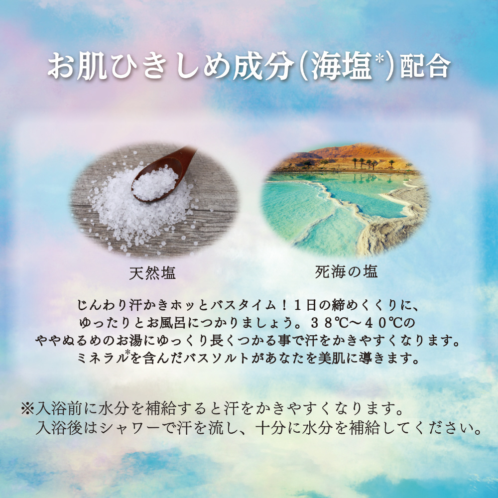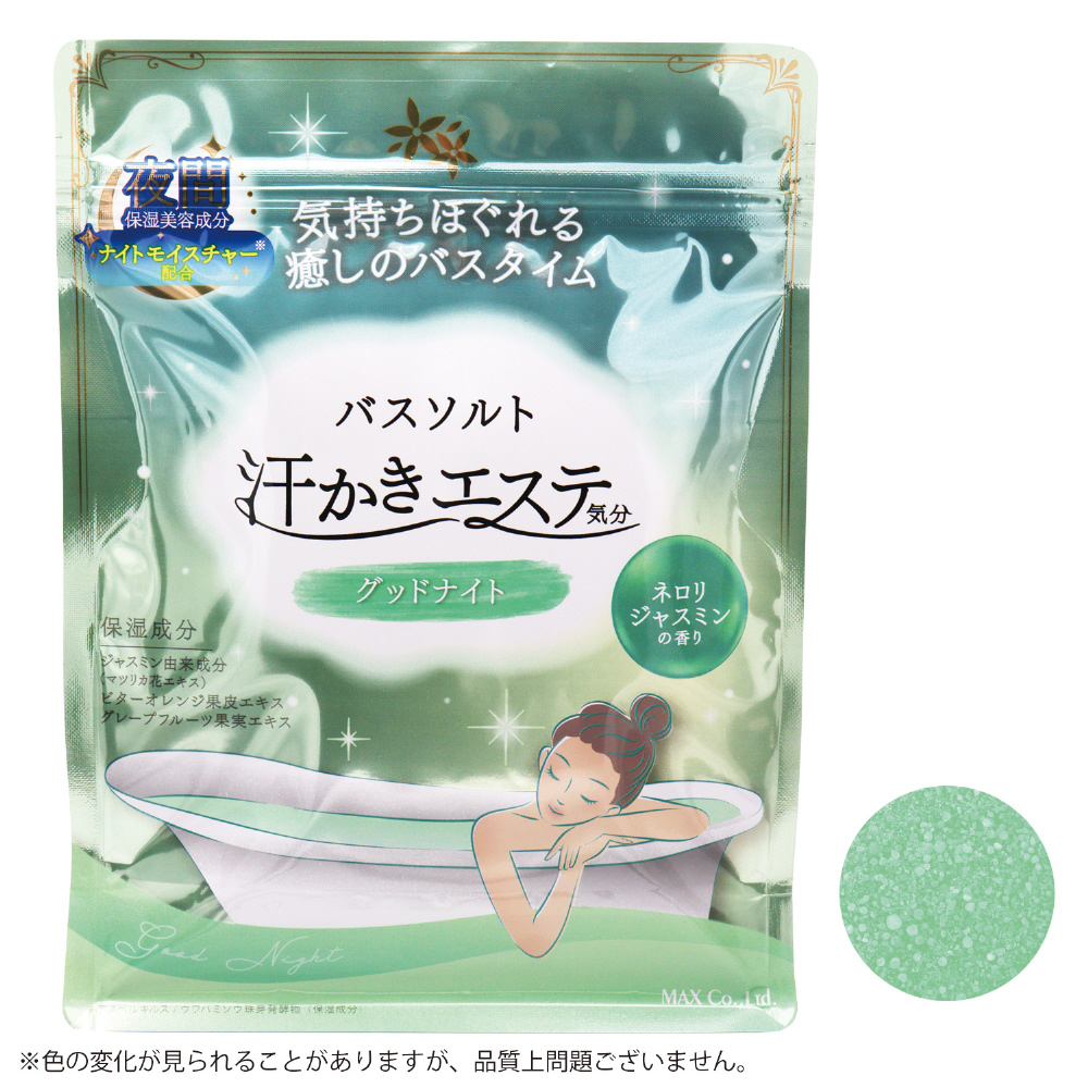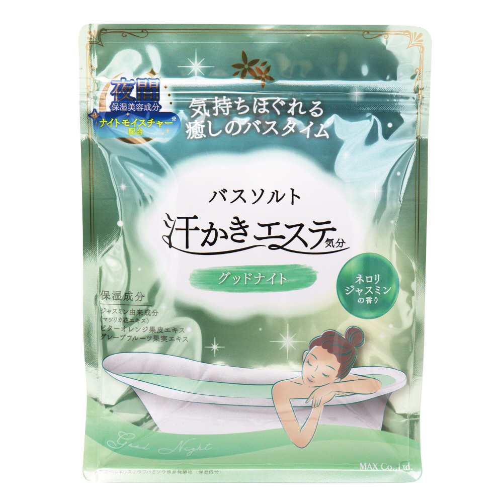 ●お湯につかって、じんわり汗かき●お肌ひきしめ成分(海塩)配合のバスソルト●気持ちほぐれるネロリジャスミンの香り●お湯色は白濁したパールグリーン(にごり湯)●夜間保湿成分として「ナイトモイスチャー: アスペルギルス/ウワバミソウ珠芽発酵物」配合で入浴後もお肌しっとり●500gのボックスタイプ
