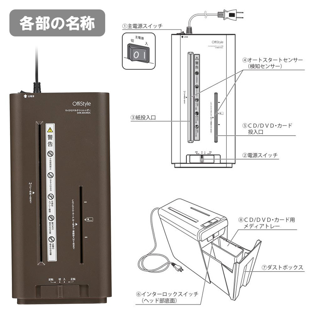 ■ 最大細断枚数:紙…A4コピー用紙(64g/m2)5枚、CD/DVD・カード…1枚