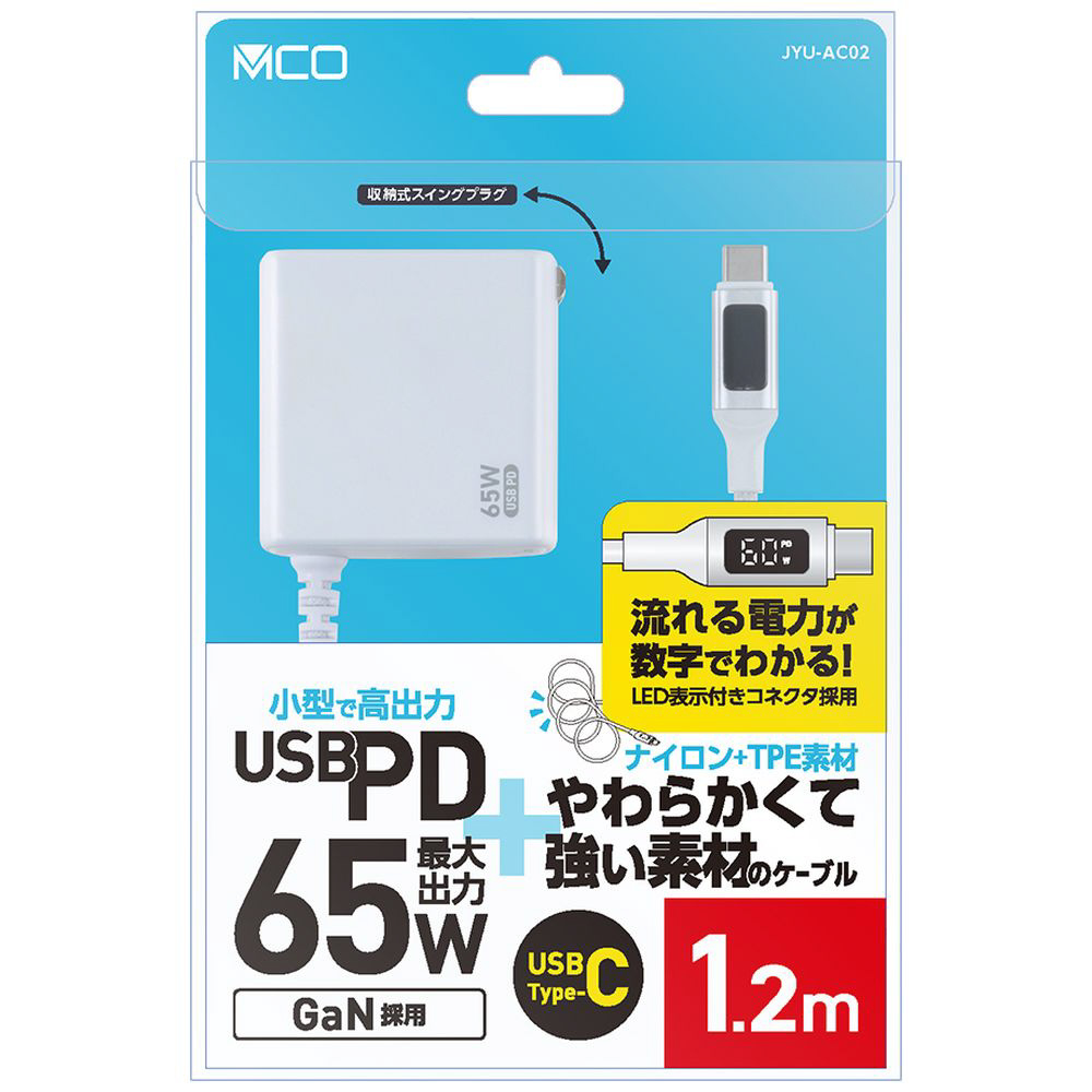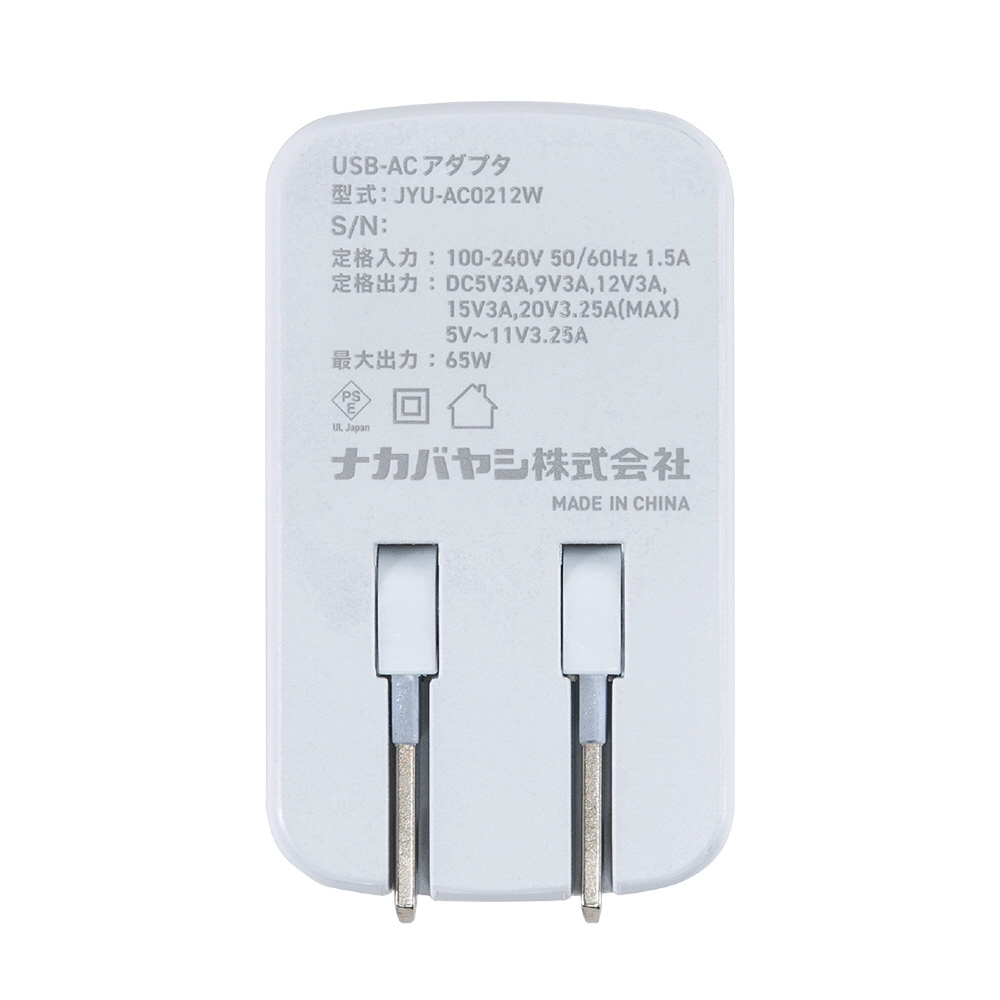 AC⇔USB-C充電器 ノートパソコン・タブレットPC対応 65W [1.2m /USB Power Delivery対応] ホワイト JYU-AC0212W