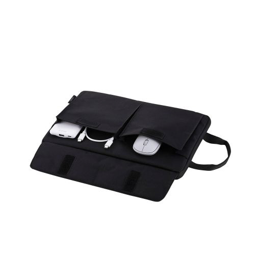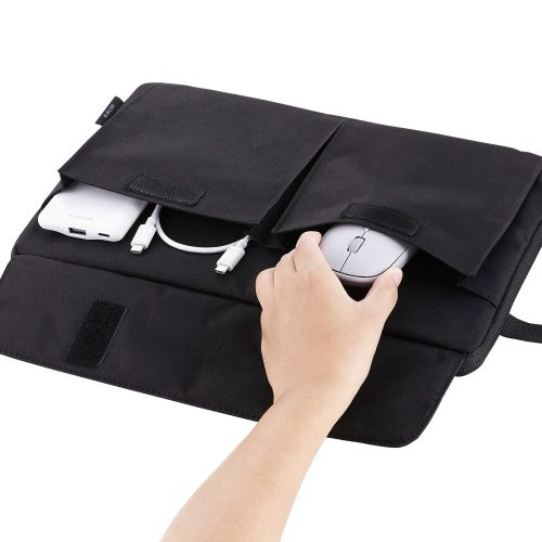 ケース前面には、用途に応じて使い分けできる2つの仕分けポケットがあり、マチ付きでマウスなど厚みがある小物の収納に便利です。