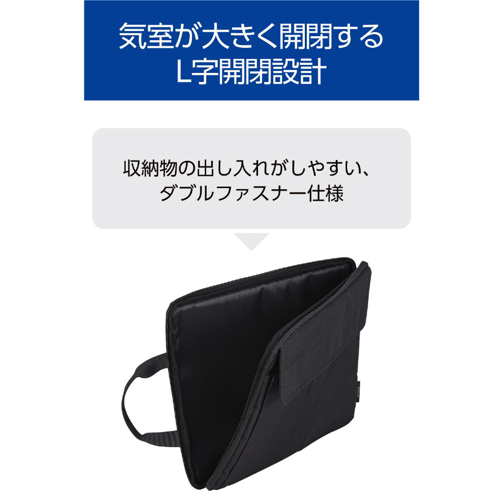 気室が大きく開閉して収納物の出し入れがしやすい、ダブルファスナー仕様のL字開閉設計です。