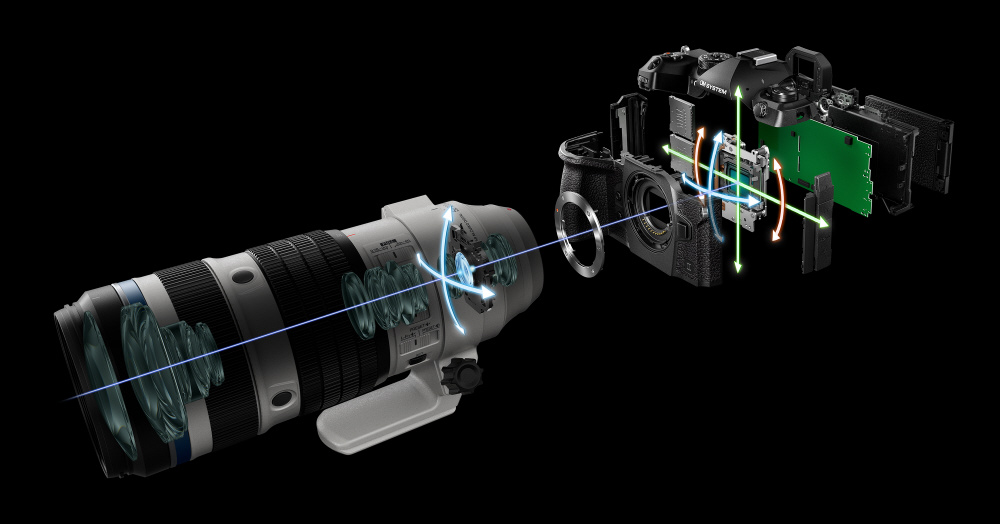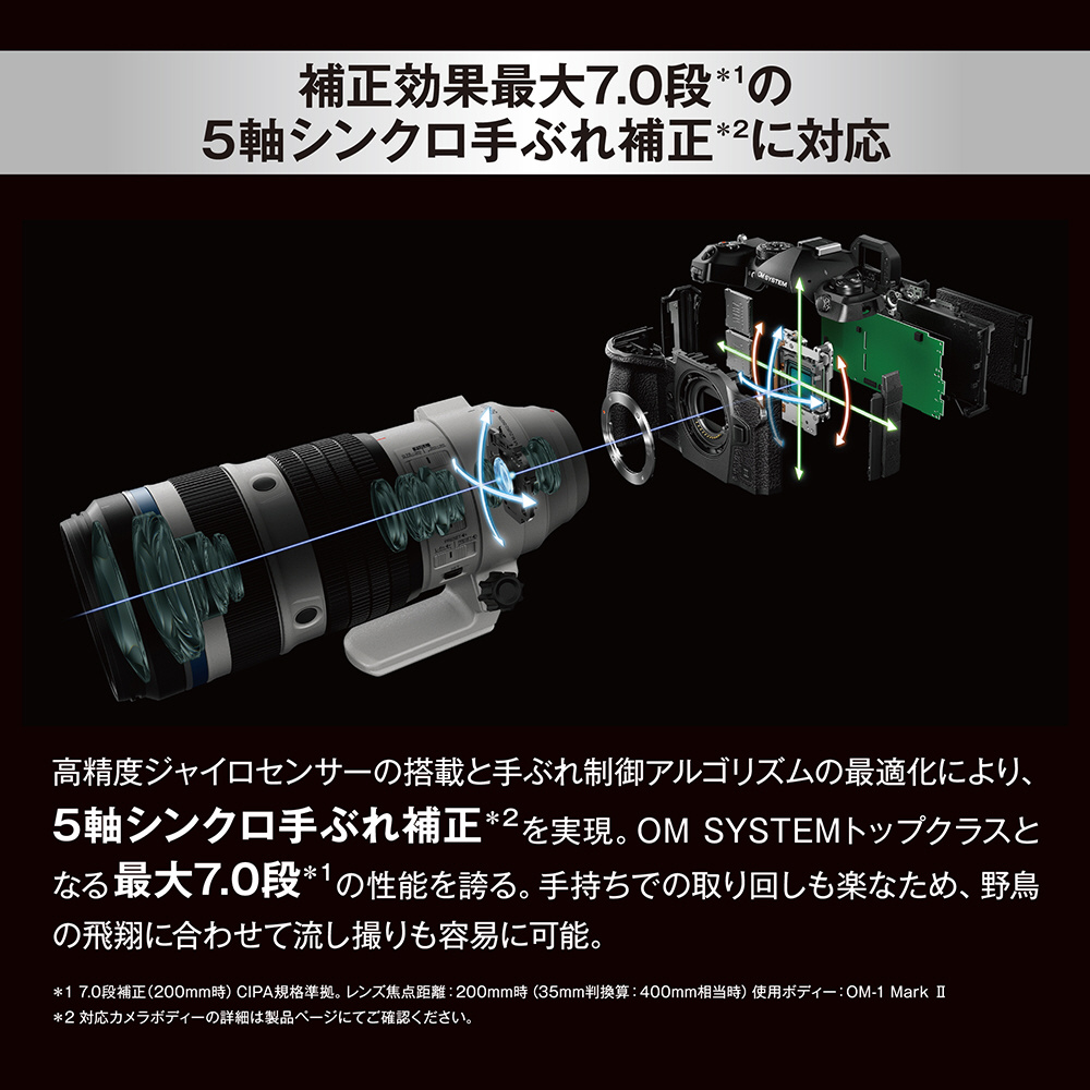 カメラのボディー内手ぶれ補正と協調する 5 軸シンクロ手ぶれ補正に対応。高精度なジャイロセンサーと手ぶれ制御アルゴリズムの最適化により、手ぶれ補正段数は 400mm 相当※1 において、世界最高レベルの最大 7.0段※2 を誇ります。