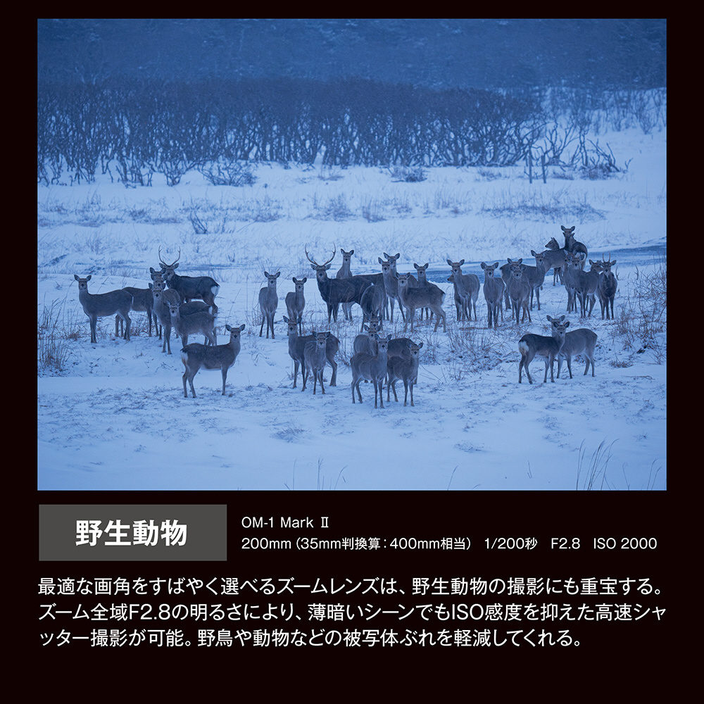 本レンズは、ズーム全域開放 F2.8 で 100-400mm 相当※1 の焦点域をカバーします。2 倍テレコンバーター使用時は最大 800mm※1 F5.6 相当となる大口径超望遠ズームレンズです。開放 F 値の明るさにより、ISO 感度を抑えた高速シャッターでの撮影が可能となり、早朝や夕暮れなどの光量の少ない時間帯に活動する野鳥や野生動物の撮影に威力を発揮します。また、広い焦点域は、風景撮影においても多彩な表現を可能とし、この一本で幅広い撮影シーンに対応します。